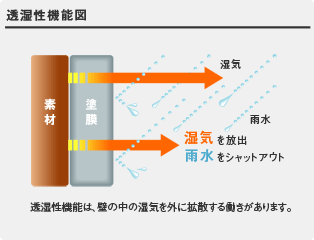 透湿性とは、住宅内部の湿気を外に排出する性質のこと。透湿性に優れ、外からの雨水を通しにくく内部からの余分な湿気を放出する理想的な塗料です。 |